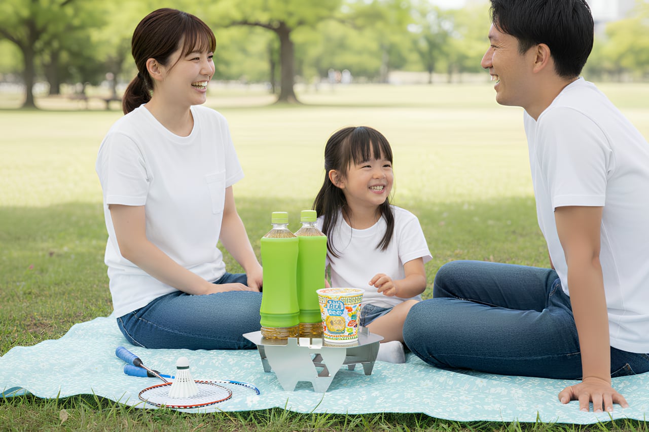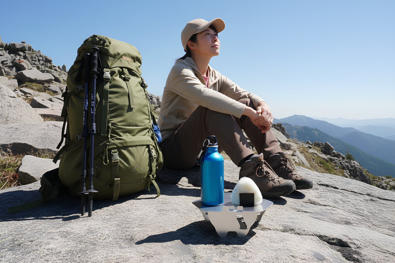 天板をひっくり返す簡単操作。ソロキャンプ、登山、公園などシーンを選ばず気軽に使える『ちゃぶスタmini』。ヒンジでもなく、ネジ1本も使わないたった5パーツだけの折りたたみ式で、軽量・コンパクト。超薄型なのでバックパック、パニアケースなどのちょっとした隙間に入れて楽々持ち運び。